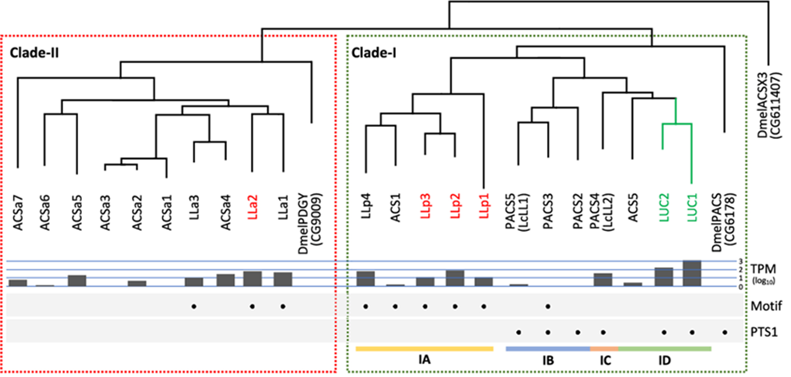 図: 今回の研究で新たに見出した、発光器にて遺伝子が発現し、かつ既知のルシフェラーゼと相同性を示すルシフェラーゼ様タンパク質(LLp1〜4、LLa1〜3)と、既存のルシフェラーゼとの系統関係を示した図。既知のルシフェラーゼ (LUC1, LUC2)は緑文字で、新たに微弱ながら発光活性を示すことが分かったルシフェラーゼ様タンパク質(LLa2, LLp1, LLp2, LLp3)を赤文字で示している。緑枠と赤枠で囲まれたタンパク質は別々のクレード(2)に分類される。発光器での遺伝子発現量を模式的に表したものがTPMであり、それぞれのタンパク質がホタルルシフェラーゼ様モチーフ(Motif)やPTS1配列を持っている場合に黒丸を付けている。発光活性を示したLLa2はホタルルシフェラーゼ様モチーフを持ちながら、既知ルシフェラーゼと別のクレードに分類され、かつPTS1配列を持っていない新しいタイプの発光タンパク質であることが明らかとなった。