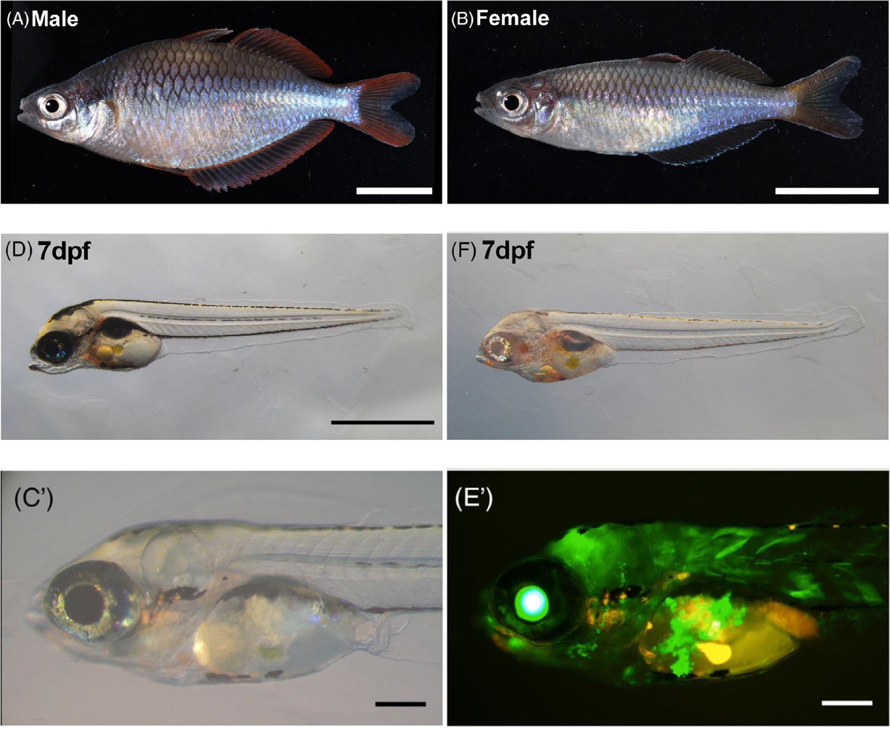 図:(A)(B)Melanotaenia praecoxのオスとメス。