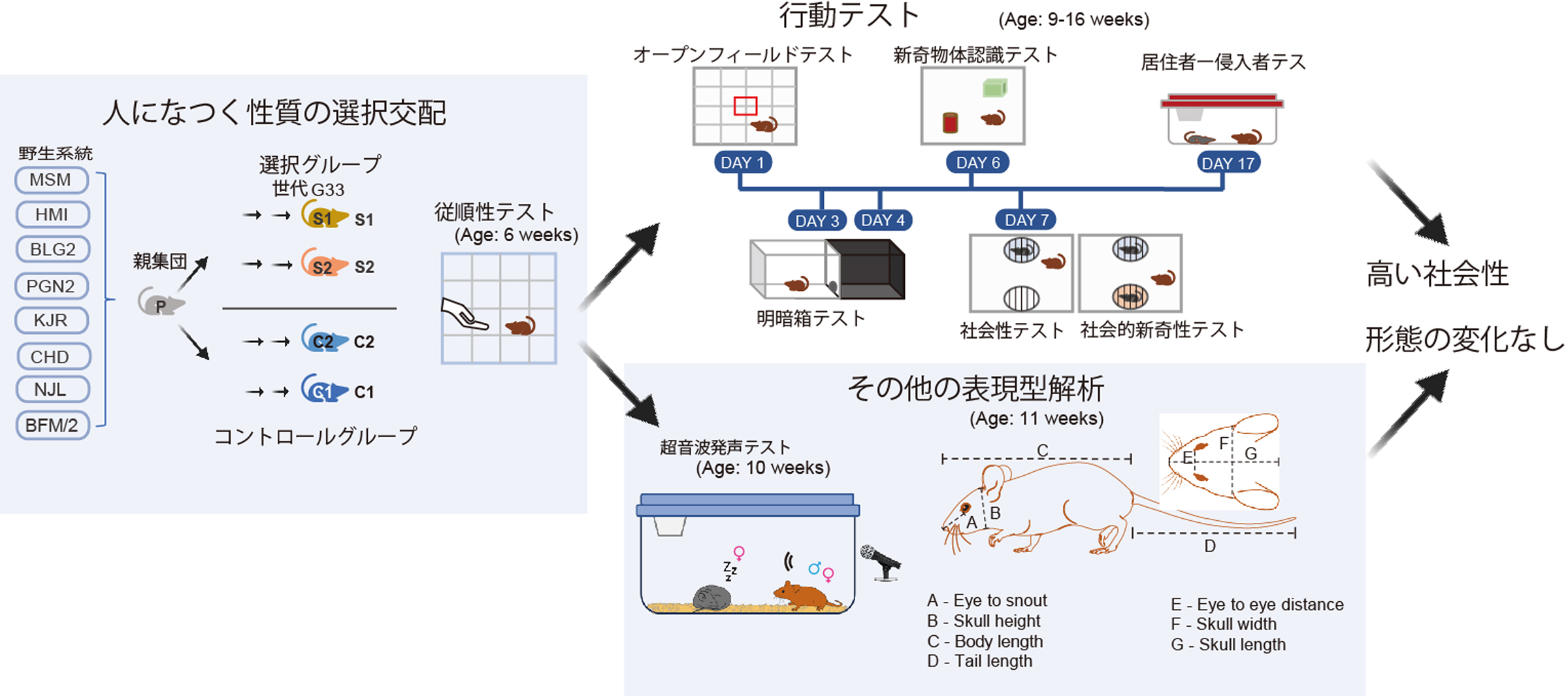 図:研究の概略と結果:人になつくマウスは高い社会性を示す一方で、家畜化症候群の兆候とされる形態変化は生じていない