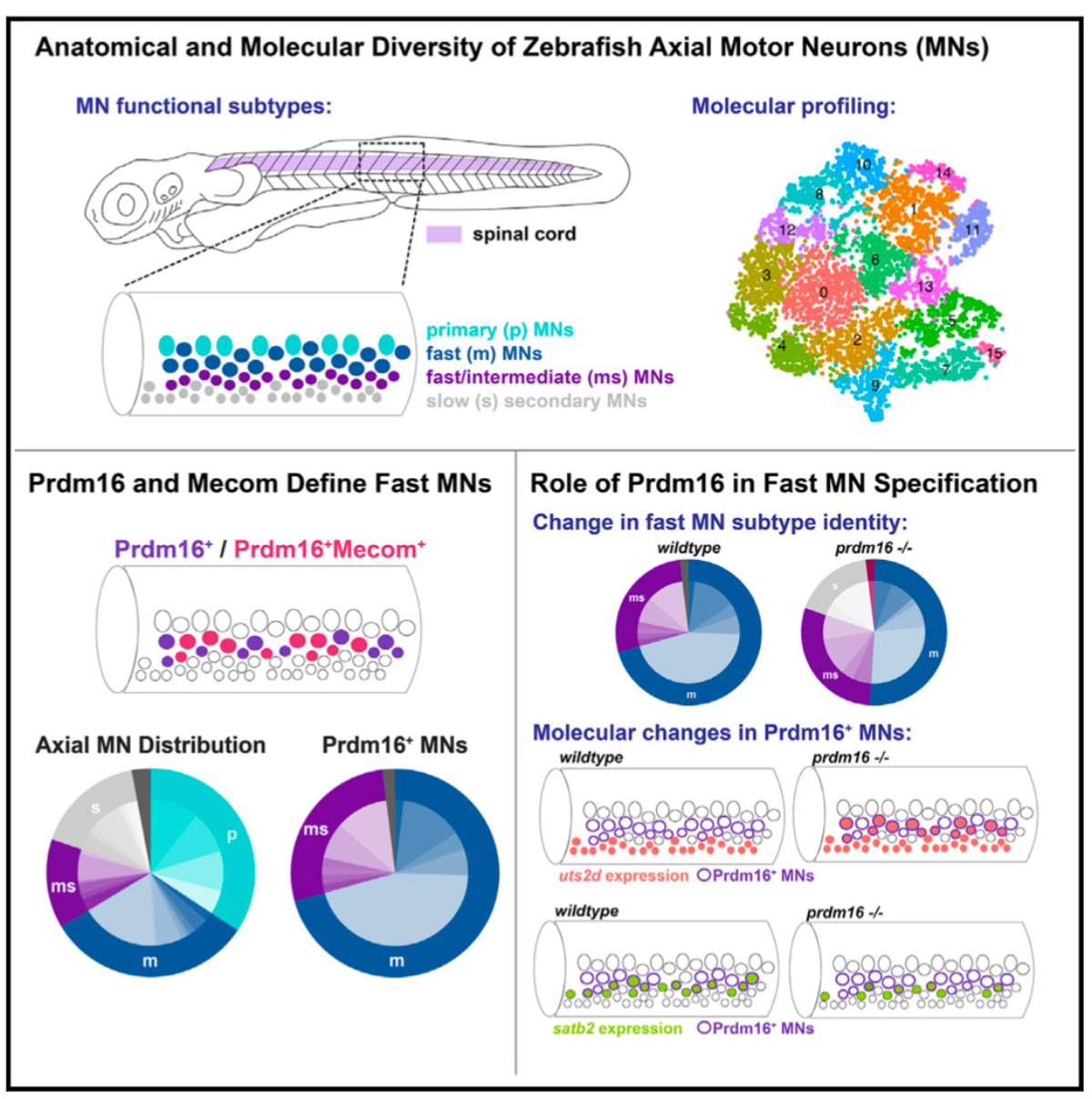 図1:ゼブラフィッシュの運動ニューロンの多様性。転写因子prdm16とmecomの発現が速い運動ニューロンを規定し、これら転写因子の欠損により速い運動ニューロンが遅い運動ニューロンの特徴を示すことを表している。