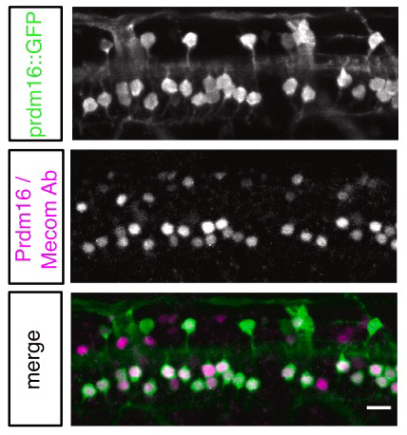 図2:トランスジェニックフィッシュを用いたprdm16とmecom発現運動ニューロンのオーバーラップ。