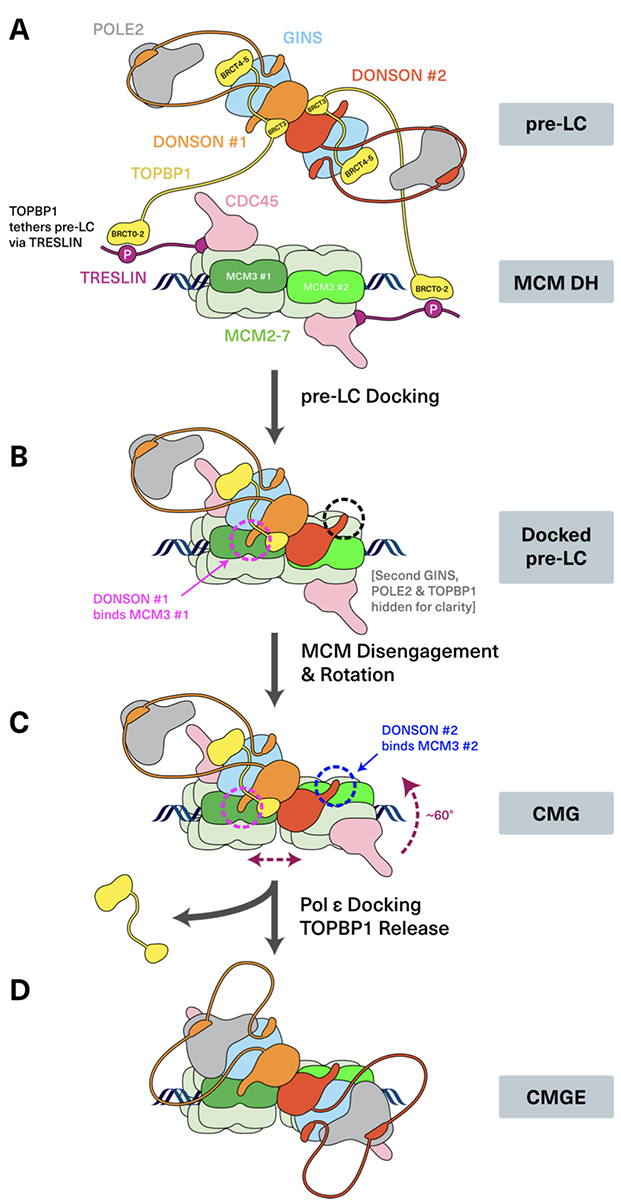 図:複製開始反応におけるCMGヘリカーゼを構成に至るまでのモデル図。
