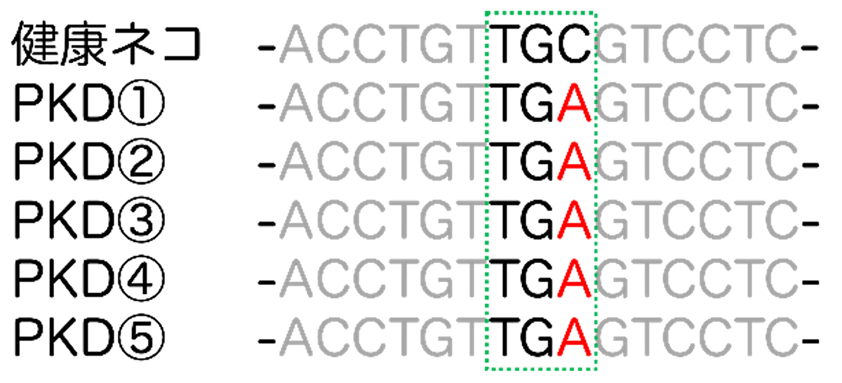 多発性嚢胞腎を発症したネコの多くでPKD1遺伝子のエクソン29に”TGC”がストップコドンである”TGA”に置換するナンセンス変異(chrE3:g.42858112C>A)を認める。