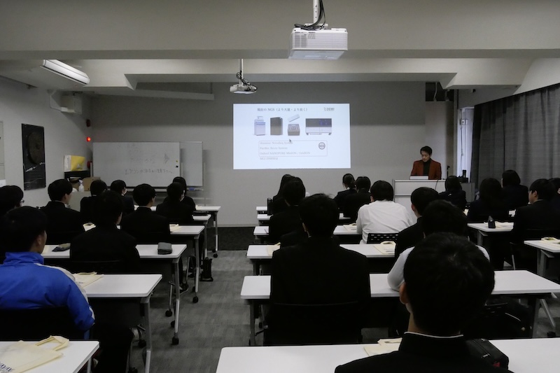 清水東高校の生徒に講義をする中村保一教授 静岡県立清水東高校理数科1年生約40名が12月17日、国立遺伝学研究所を訪問し、大量遺伝情報研究室の中村保一教授と植物遺伝研究室の佐藤豊教授による講義が行われました。また、比較ゲノム解析研究室の豊田敦特任教授によるシーケンサー室の見学と、佐藤教授によるイネ栽培施設の案内も行われ、最先端の遺伝学研究に触れていただきました。