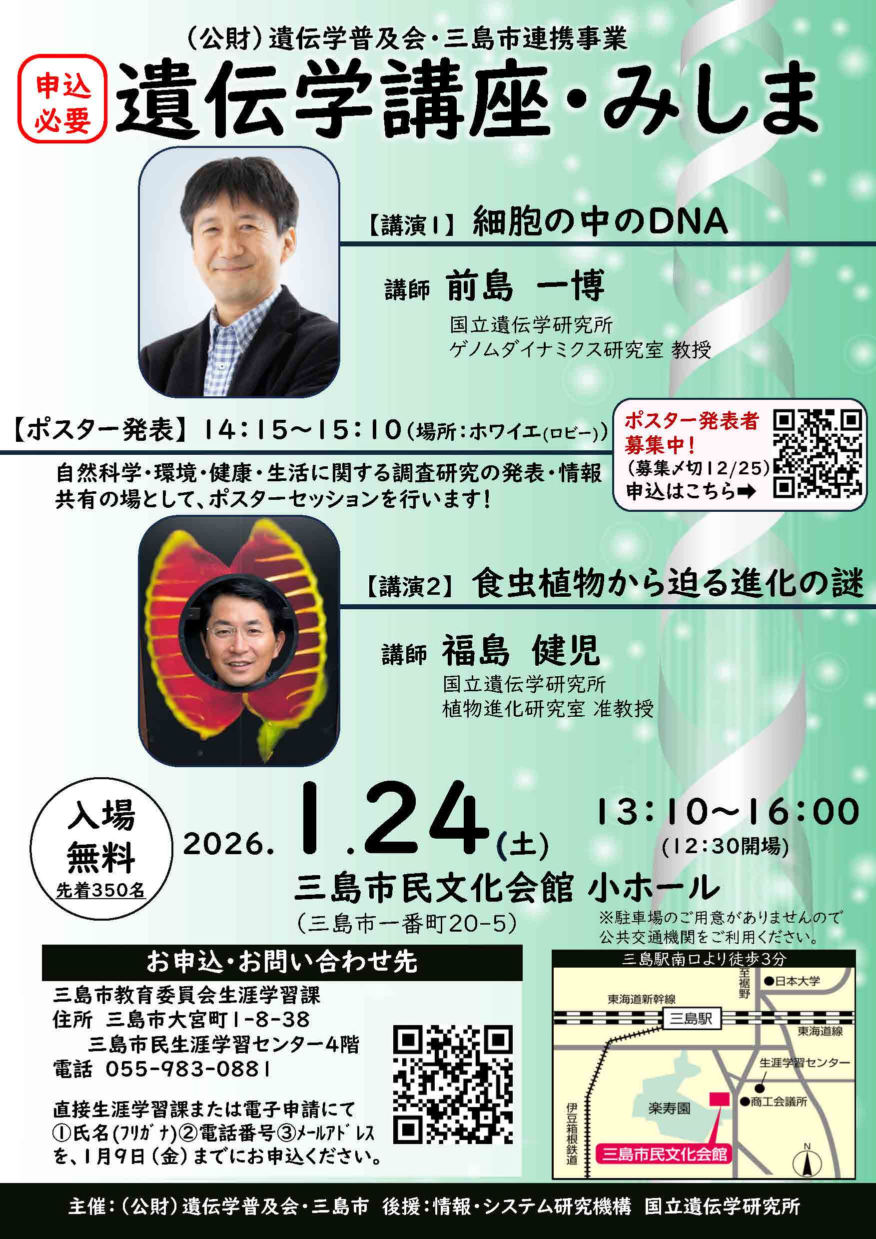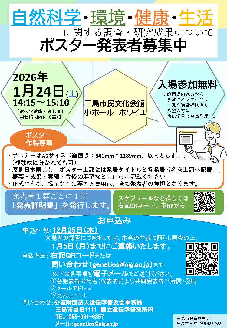 同日開催「遺伝学講座・みしま」講演の合間に、自然科学・環境・健康に関する調査・研究成果についてポスター発表を行う。
