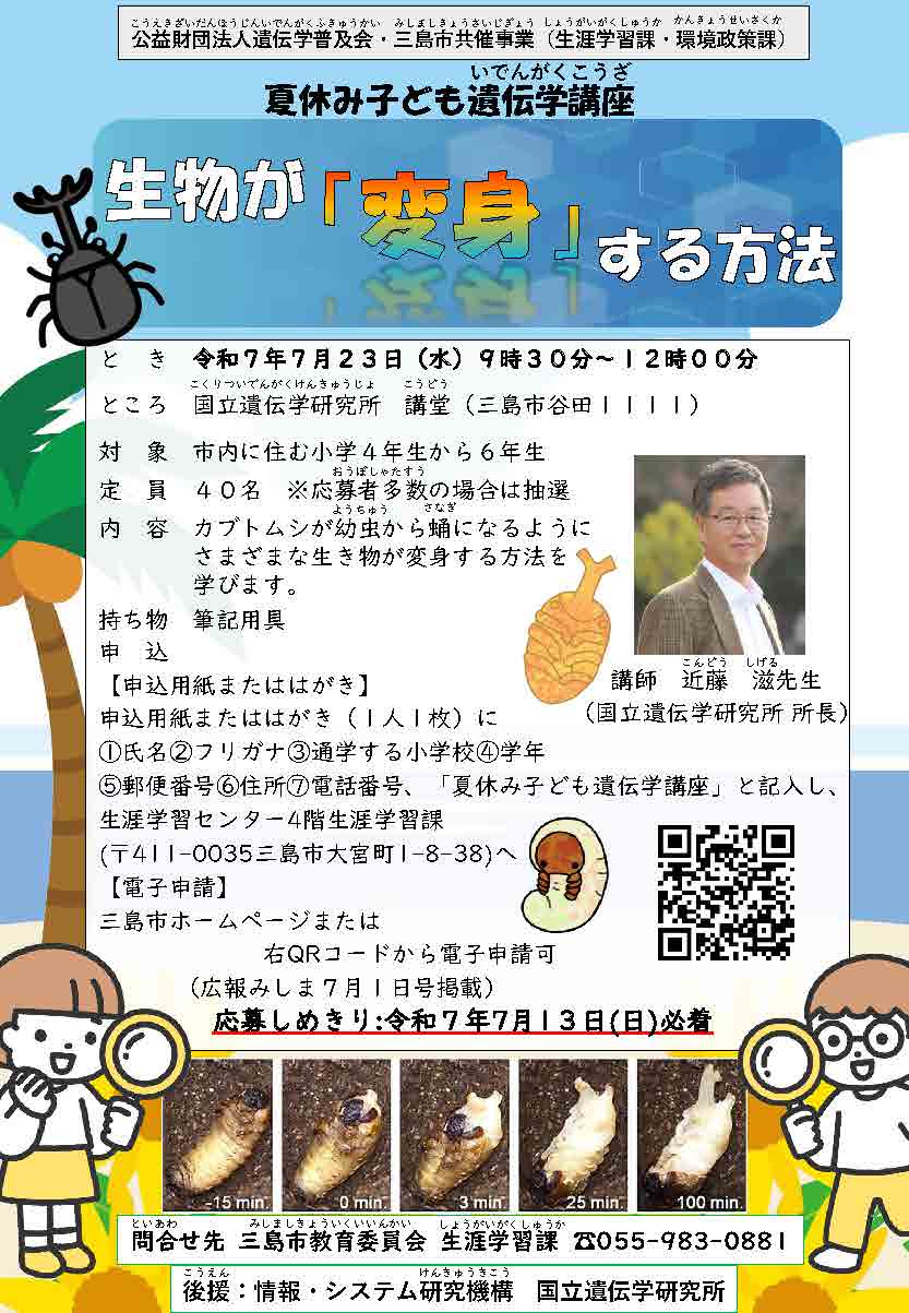 「夏休みこども遺伝学講座」と記入し、生涯学習センター4階生涯学習課へ。