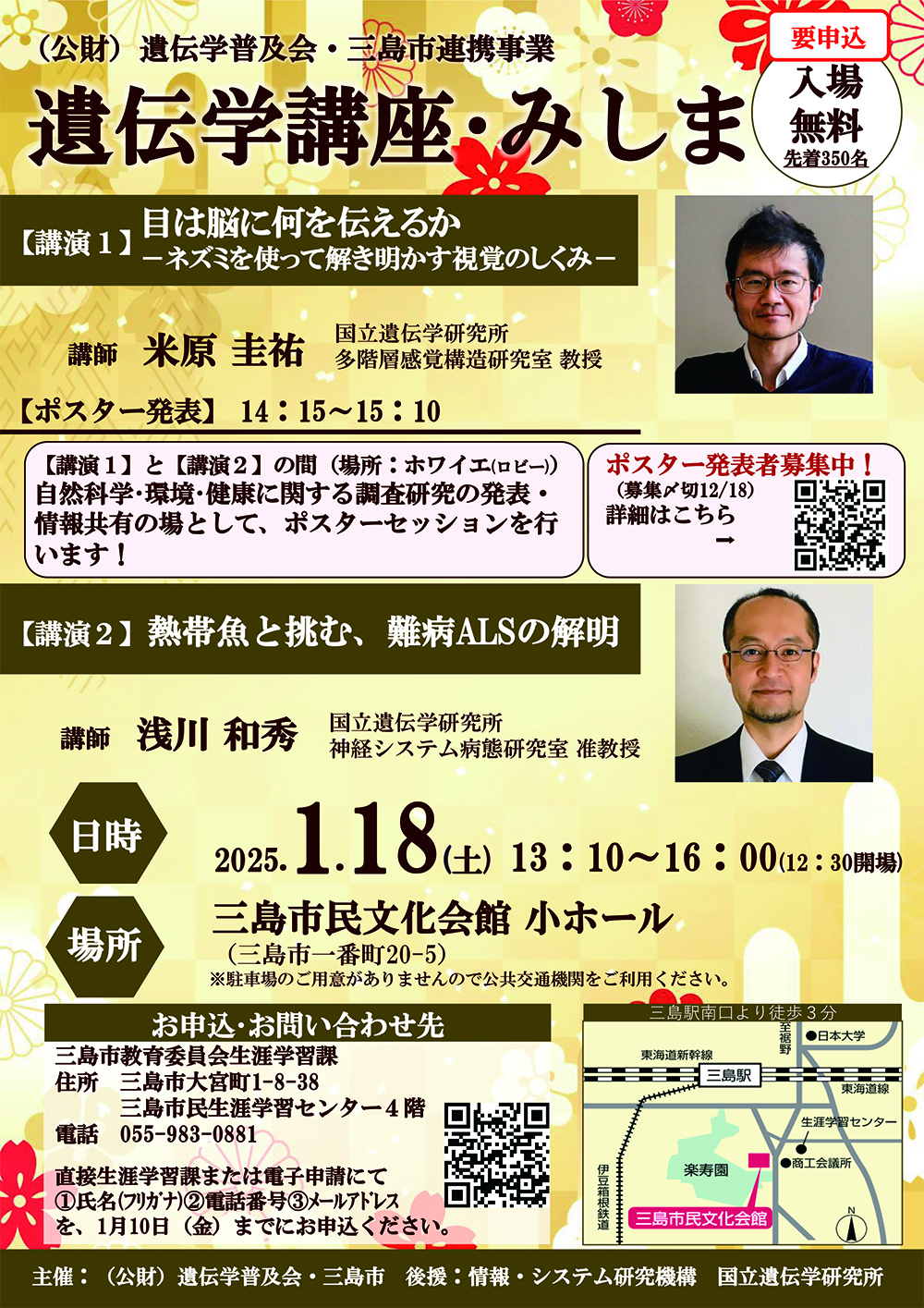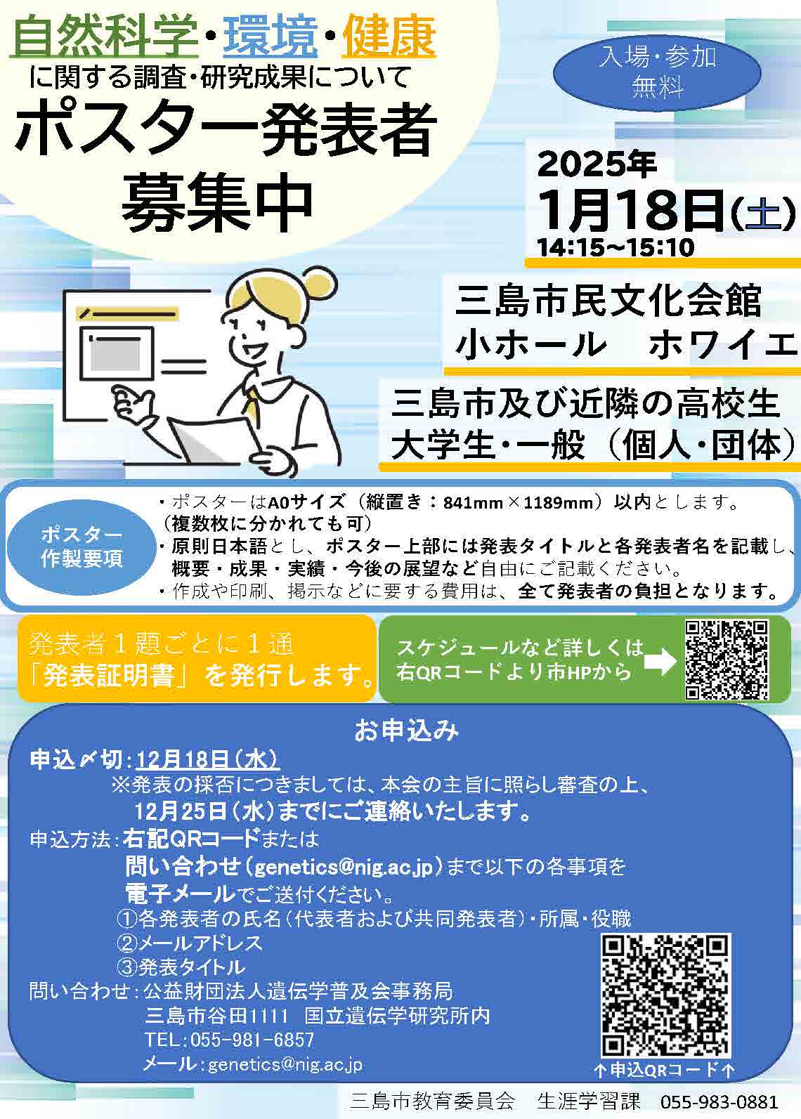 同日開催「遺伝学講座・みしま」講演の合間に、自然科学・環境・健康に関する調査・研究成果についてポスター発表を行う。