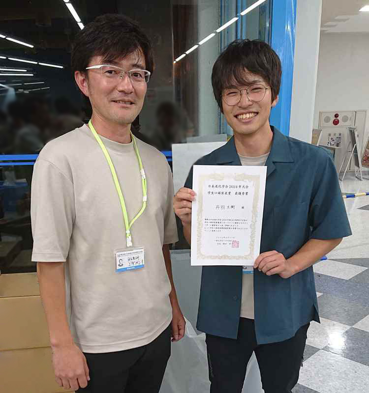 分子生命史研究室の丹羽大樹さん(総研大遺伝学コースD5・学振特別研究員)は8月21~24日に開催されました 第26回日本進化学会神奈川大会 にて学生口頭発表賞の最優秀賞を受賞しました。 タイトル:サメ・エイ類の性染色体は起源の古さに反して遺伝子量補償を欠く 第26回日本進化学会神奈川大会 工樂研究室・分子生命史研究室 丹羽大樹さん(右)と工樂教授(左)