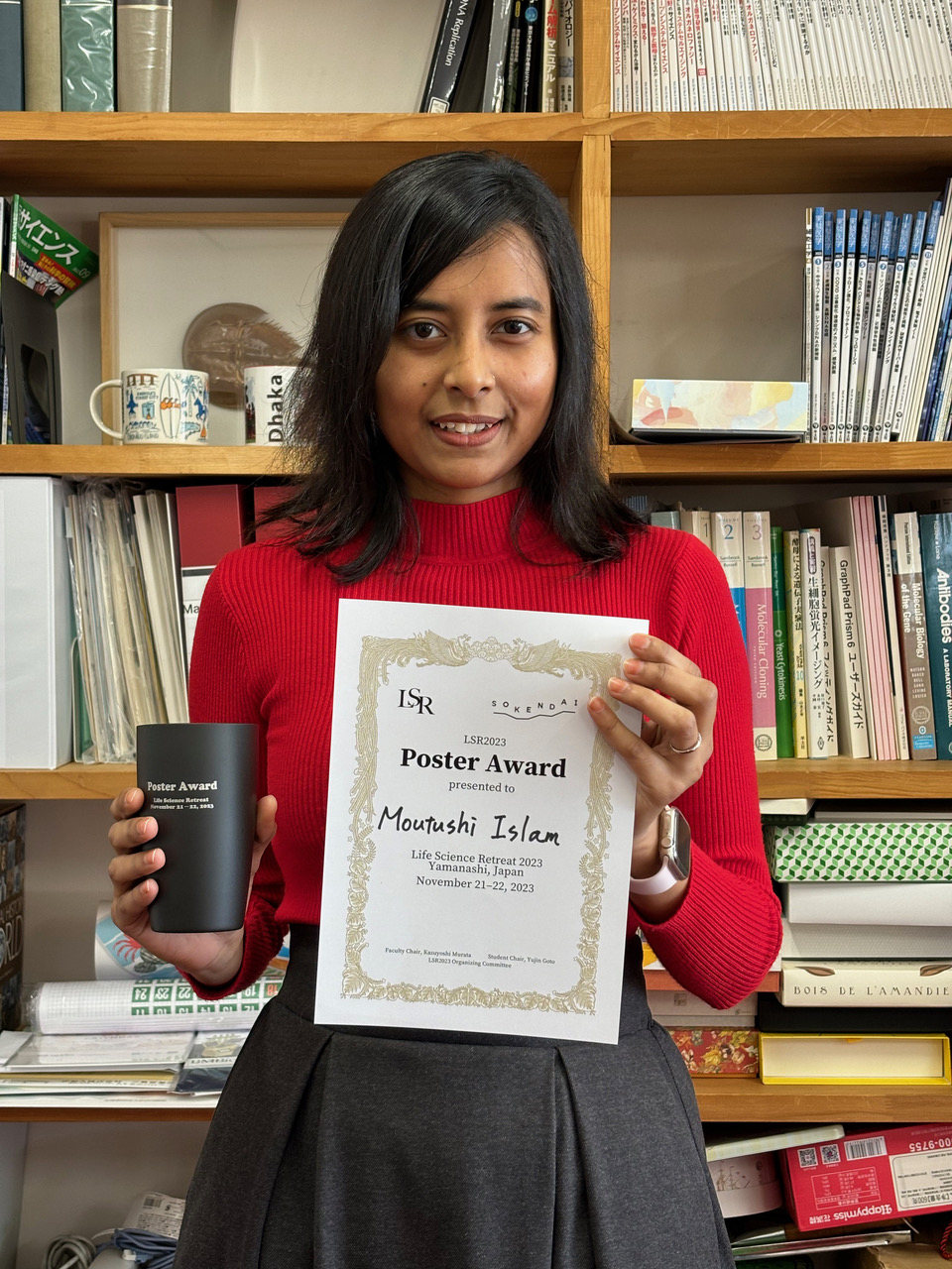 分子細胞工学研究室のMoutushiさん(総研大遺伝学コースD4)が、2023年11月21日-22日に山梨で開催された2023年度生命科学リトリートでポスター発表をおこない、ポスター賞を受賞しました。