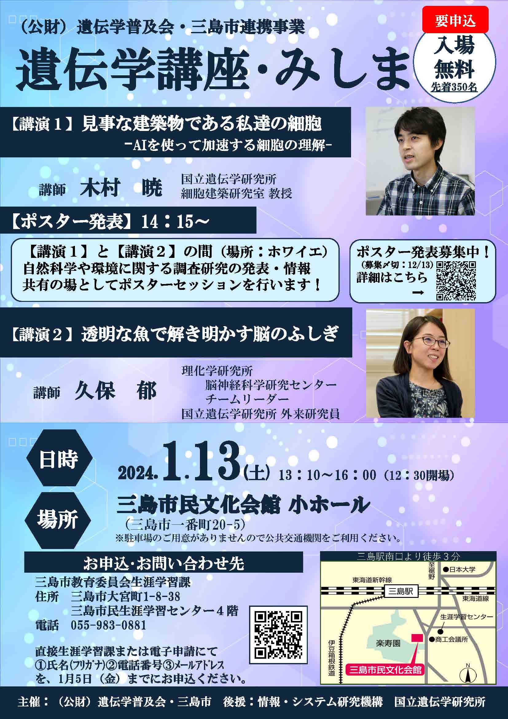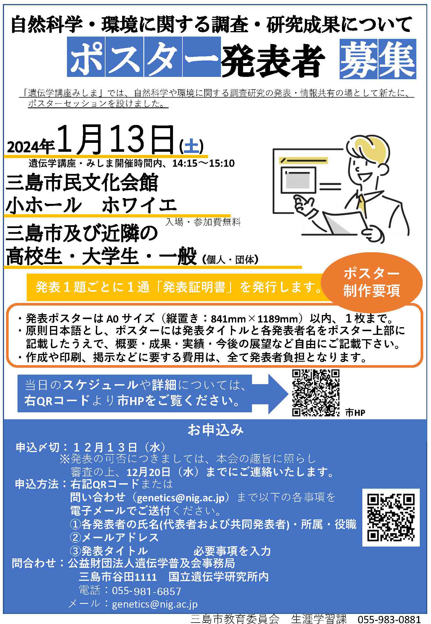 同日開催「遺伝学講座・みしま」講演の合間に、自然科学・環境に関する調査・研究成果についてポスター発表を行う。