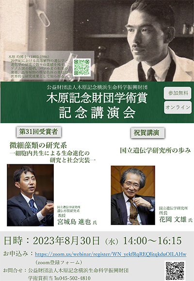 第31回木原記念財団学術賞を本研究所の宮城島進也教授(共生細胞進化研究室)が受賞しました。木原記念財団より記念講演会がオンラインで開催されます。お申し込みによりどなたでもご聴講いただけます。