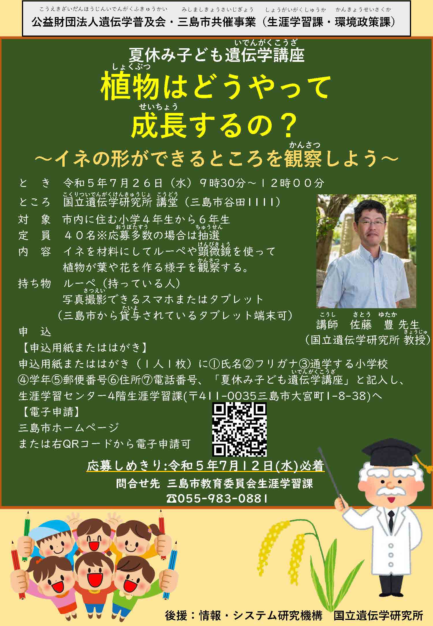 三島市教育委員会 生涯学習課 申込用紙・はがき・電子申請でお申込みください。 7/12(水)までに ①氏名 ②フリガナ ③通学する小学校 ④学年 ⑤郵便番号 ⑥住所 ⑦電話番号 「夏休みこども遺伝学講座」と記入し、生涯学習センター4階生涯学習課へ。 〒411-0035 三島市大宮町1-8-38 電話:055-983-0881