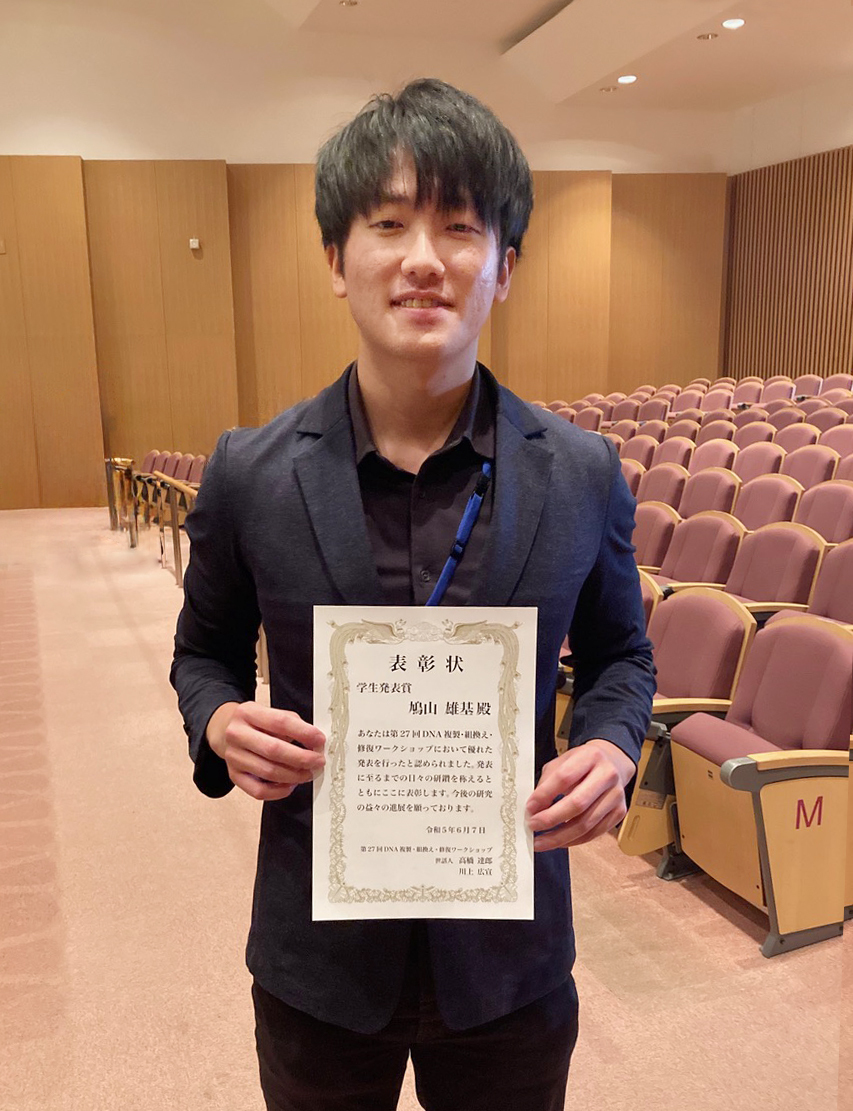 分子細胞工学研究室の鳩山雄基さん(総研大博士課程4年)が、2023年6月5日〜7日に九州大学医学部百年講堂で行われた、第27回DNA複製・組換え・修復(3R)ワークショップにおいて口頭発表を行い(演題:Enhanced AID2-based protein knockdown systems for the analysis of biological pathways)、学生発表賞を受賞しました。 本ワークショップは国内の3R研究者が二年毎に集まって開催している歴史ある研究会です。