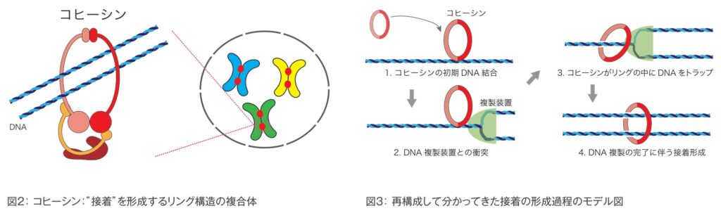 先にも触れましたが、生物のゲノムDNAは、細胞よりもはるかに長大です。細胞の中には、この長いゲノムDNAに結合し、折りたたんでまとめる役割を持つタンパク質が多数存在しています。姉妹染色分体間接着を形成するのも、「コヒーシン」と呼ばれるDNAに作用するタンパク質複合体の一種です。DNAに結合するタンパク質は、ヒストンをはじめ、さまざまな種類がありますが、その中でもコヒーシンは、リング状の構造を持った特徴的な形をしています。コヒーシンは、四半世紀近く前に同定され、このリング構造を利用して、接着を形成すると長らく考えられてきました。つまりコヒーシンは、姉妹染色分体の一対のDNAをリングの中に取り込み、束ねる分子バンドルとして働くことで、接着を形成するであろうというモデルです(図2)。絵にすると非常に分かりやすく合理的です。しかし、その分子メカニズムは、未だ明らかにされていません。私たちは目下、こ人工的に再現することで分かってきた接着の形成メカニズムの重要なタンパク質の働きの全容解明に挑んでいます。