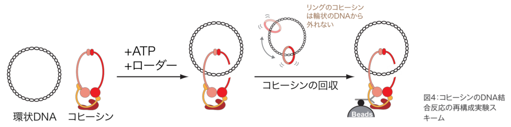 込むという活性を、本当に有するのかどうかを検証していきました。ところで、どうやって“リングの中にDNAが通っている”という状態を検出したらいいでしょうか。電子顕微鏡などで観察するというのは、最も直接的です。しかし、こういった方法は非常に時間がかかるため、この活性が本当にあるかどうかも分からないまま、反応条件を設定し、実験を行うというのは現実的ではありません。また、後に他グループの研究から、コヒーシンは柔らかくフレキシブルなリング構造を作るため、たとえ電子顕微鏡で見たとしても、リング形を観察できるものは少ないことも分かってきました。そこで、簡便で迅速に活性を検出できるように、次のような実験をデザインしました(図4)。