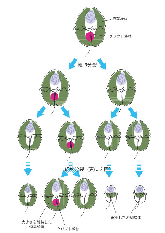 そこで、安定した培養ができるように工夫するとともに、透過電子顕微鏡での観察を重ねることによって、このプロセスの記録に初めて成功しました(図 1)。この種が細胞分裂すると盗葉緑体も2つに分かれますが、捕食されたクリプト藻が持っていた細胞核(図 1 に赤色で示された「クリプト藻核」)はどちらかの細胞にしか受け継がれません。細胞分裂が繰り返されると、クリプト藻核をもつ細胞では盗葉緑体が大きいまま保たれますが、クリプト藻核をもたない細胞では盗葉緑体がだんだん小さくなってしまうことがわかったのです。