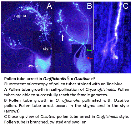 I’ve looked at pollen tube growth in interspecies pollinations between wild and cultivated rice and identified some barriers to the pollen tube growth-i.e. locations where the pollen tubes fail to extend when the pollen and pistil are not from the same species. If there is such a barrier it means there is failure in communication and recognition between the pollen and the pistil. Perhaps at that location there is a mechanism to guide or recognize the pollen tube, which fails when the pollen and pistil are of different species.