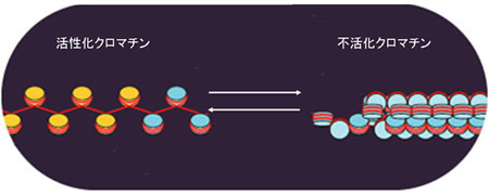 DNAは染色体の中ではヒストンというタンパク質と結合しており、クロマチンと呼ばれます。クロマチンが折り畳まれることで、非常に長いDNAがきちんと核の中に納まります。 染色体の中で、クロマチンが凝集するとDNAが不活化し、ゆるむとDNAが活性化します(図1)。染色体はクロマチンの構造を変化させることで、DNAのはたらきを調節しています。