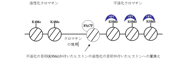FACTがはたらいてクロマチン構造が変化すると、不活化の目印であるメチル化ヒストンが、活性化の目印が付いたヒストンに置き換わります。 そのヒストンが、砦になってヒストンのメチル化とHP1の結合が広がるのをおさえます。するとその砦の反対側のクロマチンはゆるみ、遺伝子がはたらけるのです(図2)。 そのため、赤と白がまじった斑入りの眼になるわけです。マラーの発見から80年経って、やっと謎が解けました。