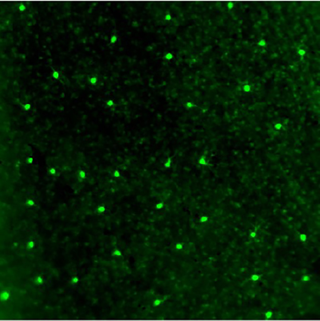 眼の網膜は、光を受容する器官です。そこで受け取った視覚刺激は、網膜から脳へと送られます。私は、網膜で蛍光を発していたGFP標識細胞が、脳のどこに伸びていくのかを見てみました。すると、「副視覚系の内側核」という脳の部位に伸びているように見えました。