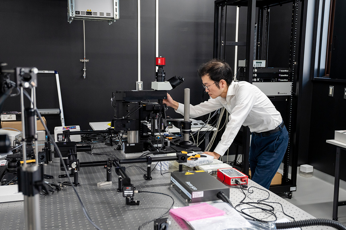 遺伝研には2021年10月に着任し、2023年度まではオーフス大学と兼任しています。日本でもいくつか助成金を得られたこともあって、2台の二光子顕微鏡を新しく購入することができました。遺伝研で行いたいと考えていることの1つは、霊長類を用いた解析です。マーモセットを用いた研究に着手して、マウスで見つけた知見がどれくらい霊長類とも共通しているか、あるいはどこが違うか、それを調べたいと思っています。そしてそれをヒトの視覚の理解や病気の治療にも役立つ知見に結びつけていきたいと考えています。