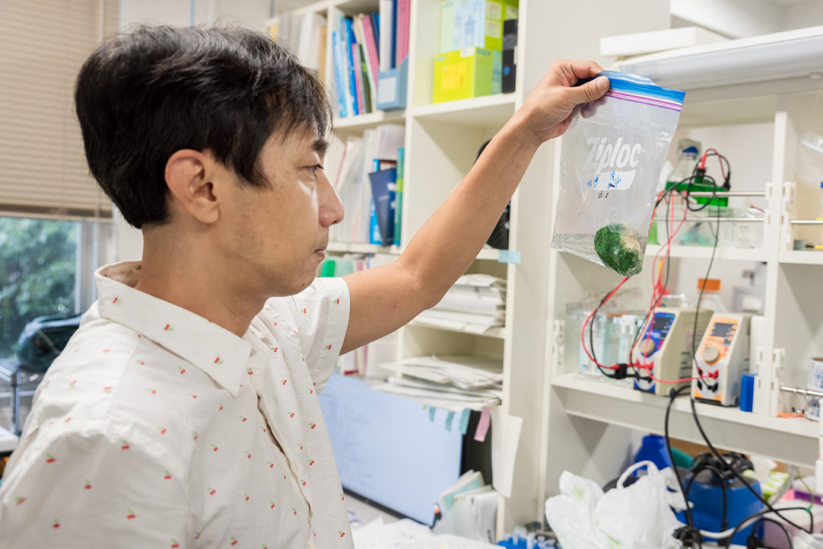 宮城島は、シゾンと国内で見つけた新種を、機能性食品や飼料として産業利用するための基礎研究を行うグループにも属しており、そのリーダーとして、すでに8年目を迎えている。シゾンのような微細藻類(個体の識別に顕微鏡が必要な藻類のこと)は、陸上植物に比べて光合成能力が高く、生育場所を選ばずに大量培養が可能なので、いくつかの種がすでに産業利用されている。「そうした微細生物に比べても、シゾンとこの新種はさらに優れた特徴を持ちます」。細胞壁がないことはもちろんであるが、さらに、セルフクローニング法(遺伝的改変法の一種)を開発できたことや、酸性水で増殖するので、他の生物の混入増殖の恐れがなく、屋外で大量培養できることなどである。