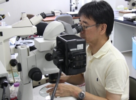 澤先生は「線虫」を使って、「非対称分裂」のしくみを研究している。「線虫はすべての細胞が簡単に見える。染色したり、切片にしなくていい。生きているまま、スライドガラスに乗っければ、体が透明なので奥の方の細胞も見える。卵から成虫になるまでずっと観察できる。線虫を使って研究する面白さはここにあります。」研究テーマである「非対称分裂」は、細胞が分裂して2つになるとき、同じものが2つできるのではなく、別々の細胞ができる現象だ。「例えば分裂して2つになったとき、片方は小さくてすぐ死んでしまうというものがあります。傷ついたり病気になったのではなく最初から死ぬことが決まっている。なぜ片方だけがそうなるのか?不思議ですよね。」