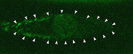 細胞が分裂するときに、細胞の中で何かが偏って存在しているのではないか?という予測を立ててそのしくみを研究してきた。証拠を見つけたのは2003年8月14日。忘れられない瞬間だった。顕微鏡をのぞくと、緑色に光るβカテニンという物質が片方の細胞にだけ集まっているのが見えた(右 写真)。「予想していたことは間違いじゃなかった!とわかったときは感動しました。でもお盆で誰もいなくて・・・感動を分かち合えなかったんです(笑)」