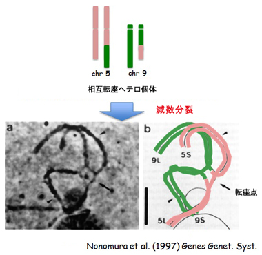 「大学時代、顕微鏡で見たイネの減数分裂にすごく感動しました。そのイネはちょっと変わっていて、対になっている染色体の片方だけ、5番目の染色体と9番目の染色体の一部が相互に入れ替わっていました。これが対合するとどうなると思いますか?普通は一直線に対合するんですが、これは十字形になるんですね。入れ替わっていても、5番は5番、9番は9番と、同じ部分はここだとお互いが認識している。顕微鏡で見るとものすごくきれいで、対合のメカニズムを解明したいと思いました。」