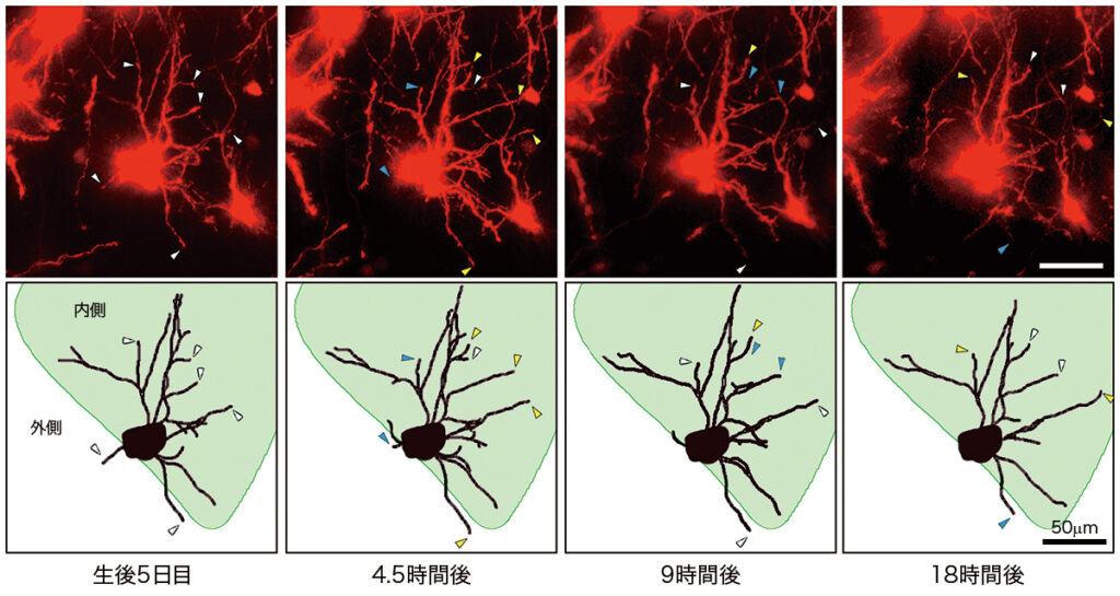 二光子顕微鏡によって観察した、新生児マウスの大脳皮質神経細胞が正常に成熟する様子。矢頭:樹状突起の先端の位置。黄色の矢頭:伸びた枝。青色の矢頭:縮んだ枝。下図の緑色の部分はバレル内側。