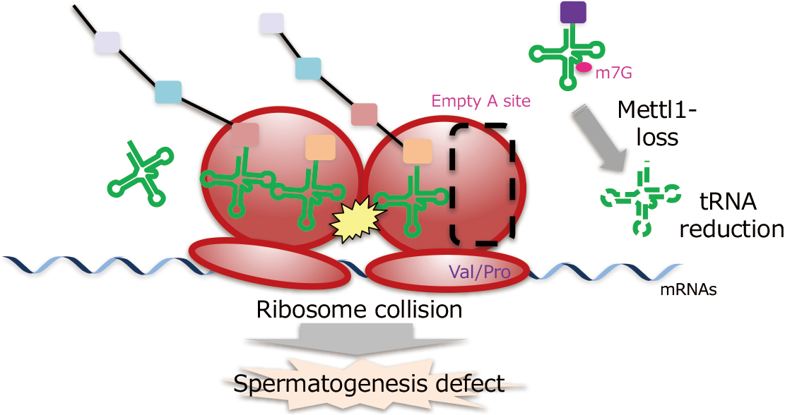 齋藤都暁教授らはショウジョウバエMettl1がm7G(N7-メチルグアノシン)という化学修飾を特定のtRNAに導くことで精子形成に必要なtRNA量と蛋白質翻訳量を確保することを発見しました。RNA修飾の異常はがん、神経疾患、などの原因となることが報告されており、それらの理解に貢献することが期待されます。