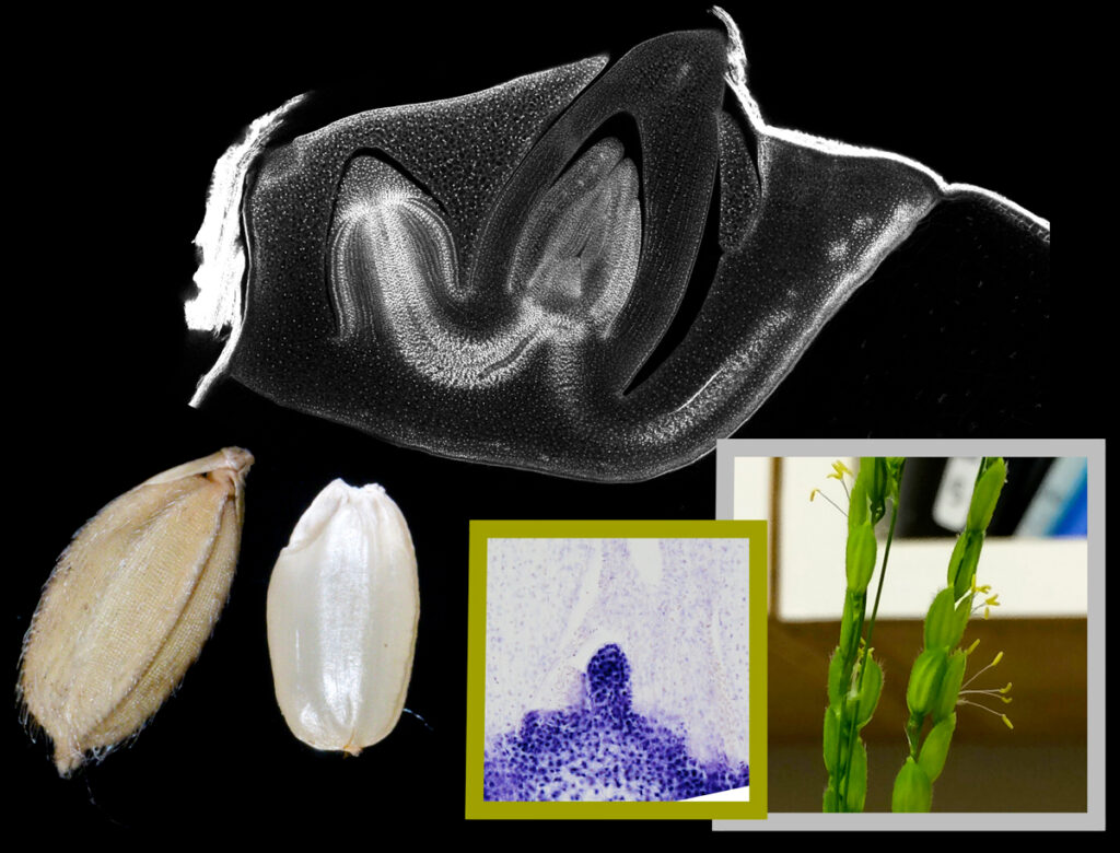 写真下段:左から、イネ籾、コメ(左上に胚がある)、茎頂分裂組織のマーカーとなるOSH1タンパクを検出した免疫染色、実験室内で開花したイネの花。