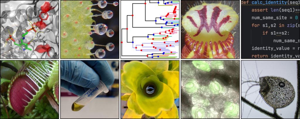 進化の果てにうまれる生物の構造や機能は、ときとして信じられないほど複雑精緻なものになります。我々のミッションは、こうした革新的形質に通底する進化の仕組みを解明することです。目的達成のため、私たちはバイオインフォマティクスと分子生物学的アプローチを統合し、さまざまな生物、特に植物に焦点を当てて研究を進めています。なかでも、動物を「食べて」しまう食虫植物を起点に、収斂進化、転用進化、劇的な形態変化、表現型可塑性、生物間相互作用、全ゲノム重複など、生物進化の鍵となる現象の解明を進めています。