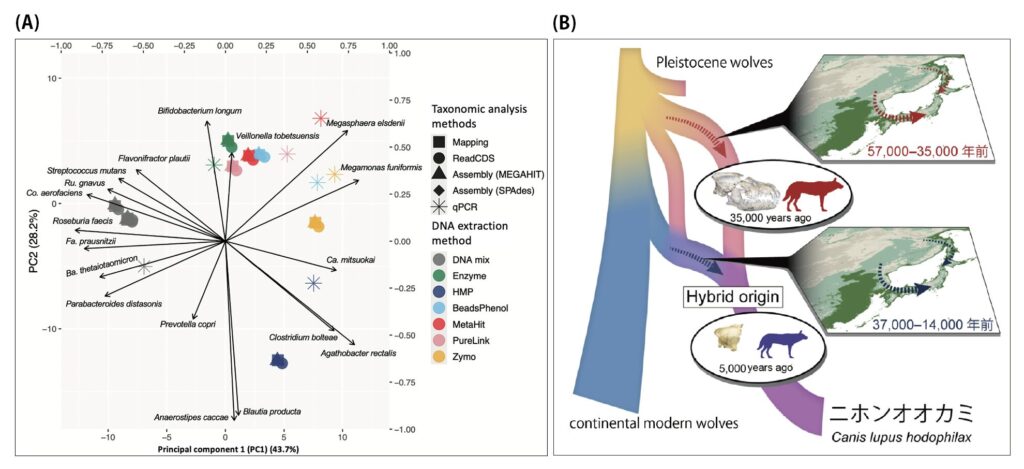 (B)3万5千年前の日本の更新世オオカミのAncient DNA解析によって推定されたニホンオオカミの系統の成立過程。我々の研究から、巨大な更新世オオカミが日本に移入した後、別の系統のオオカミが移入しそれらが交雑してニホンオオカミが成立した進化史が推定された。