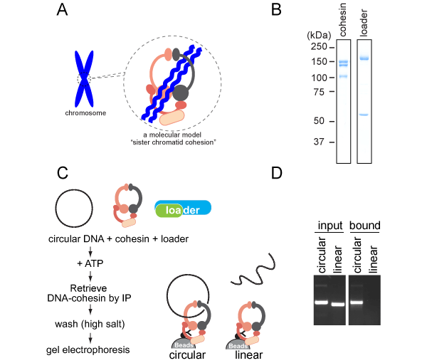 ゲノム情報を保持する染色体は、細胞の大きさに比べてはるかに長大な分子です。細胞は、これを核内に絡まることなく納め、遺伝子発現、複製、分配といった複雑でダイナミックな反応を同時に制御しています。巨大なリング状のSMC複合体(コヒーシン、コンデンシン、SMC5/6複合体)は染色体構造形成の中心となる制御因子であり、ゴムバンドのようにDNAを束ねて働くと考えられています。私たちは、SMC複合体を含む染色体構造の制御を行うタンパク質を精製し、試験管内再構成することによって、その分子メカニズムを解明しようとしています。