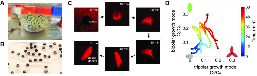 最近の研究では、ツメガエル卵(B)の細胞質抽出液を使った実験系と機械学習による画像解析手法を組み合わせ(C)、紡錘体と呼ばれる染色体分配装置が正しい二極性の構造へと自己組織形成されるしくみを明らかにした(D)。