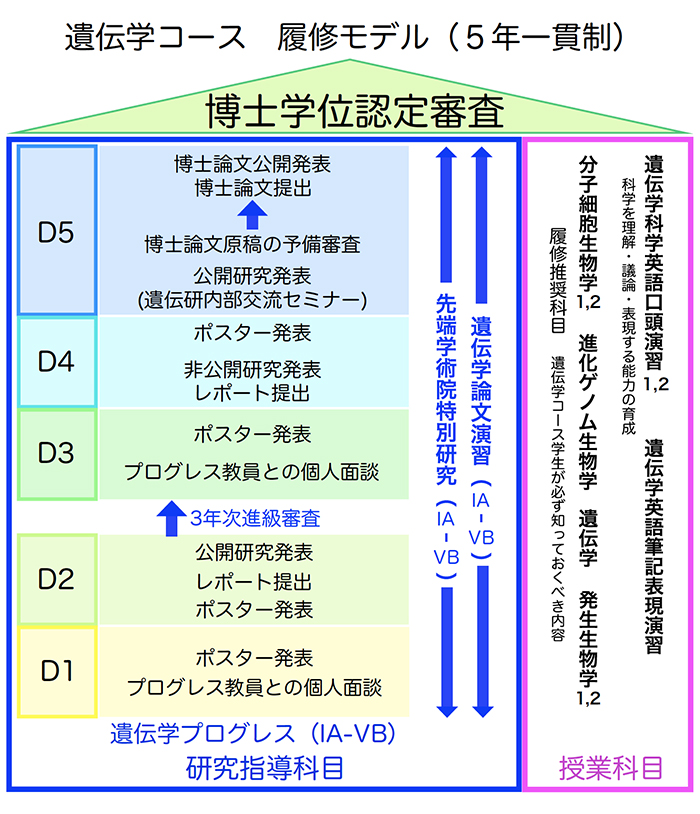 教育課程レベルでの評価としては、5年一貫制博士課程学生が2年次から3年次に進級する際に「進級資格審査」を行う。審査は「遺伝学プログレスIIB」として行い、提出された研究レポートと、公開口頭発表、質疑応答を基に、生命科学(遺伝学)における学識の深さと、自立した研究者として育ってゆけるかどうかについて、主任指導教員以外の4名のプログレス教員が審査する。不合格となった場合は、再度「遺伝学プログレスIIB」を履修することになる。