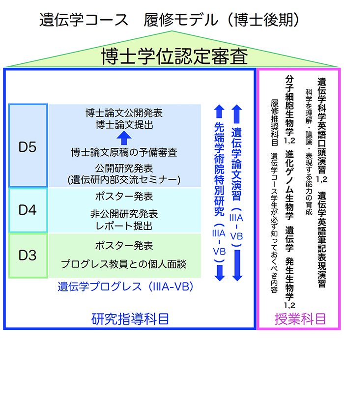遺伝学コースのカリキュラムの目的は、自立的で創造性に富み、世界的に活躍できる研究者を養成することである。学位授与方針で要求される能力が全て身につくように教育科目を以下のように編成している。